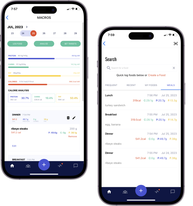 Log meals from over 550k grocery items, 140k restaurant items, and 25k common foods.